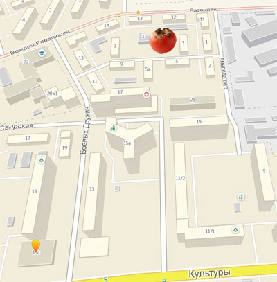 Адрес локации:Боевых дружин, 1Нанесение:маркерФормат ответа:несколько слов на русском языке